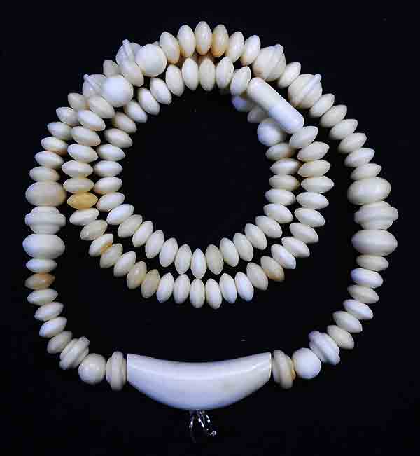 สร้อยคอกระดูกช้าง ( คล้องพระได้ 1 องค์ ) ตรงกลางเป็นสามเหลี่ยมบูมเมอแรง ขนาดความยาวทั้งเส้น 25 นิ้ว กระดูกเม็ดขนาด 9 ม.ม.หนา 4 ม.ม. ใช้เป็นสร้อยแขวนพระมงคล สวมคอได้สบายๆ ตามรูป |