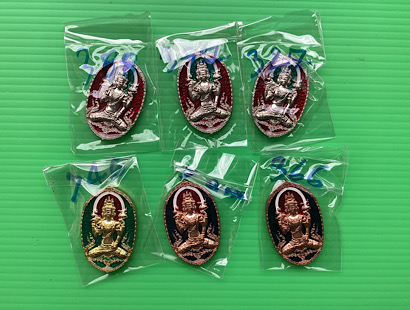 เหรียญท้าวมหาพรหม รุ่น ชนะมาร หลวงปู่สอ วัดบ้านขาม จ.สุรินทร์ เนื้ออัลปาก้าลงยา 3 เหรียญ , เนื้อทองฝาบาตรลงยา 1 เหรียญ , เนื้อทองแดงลงยา 2 เหรียญ กล่องเดิม |