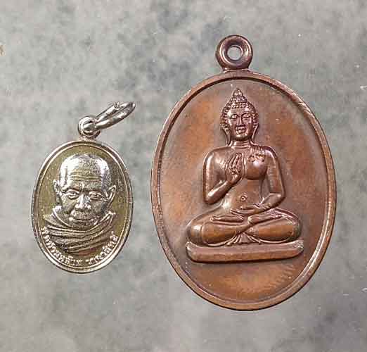 เหรียญหลวงพ่อขาว วัดเอราวัณนันทิยาราม จ.ชุมพร มีจาร + เม็ดแตงพ่อท่านคล้าย + เหรียญพระพุทธทักษิณมิ่งมงคล วัดเขากง จ.นราธิวาส ปี2539 |