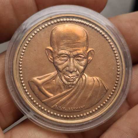 เหรียญ ม.ต. เสาร์ห้า หลวงพ่อเกษม เขมโก รุ่นเสาร์ห้ามหามงคล (บล็อกเยอรมัน) เนื้อทองแดงขัดเงาพิเศษ พิธีอธิษฐานจิตปลุกเสก วันเสาร์ 30 เมษายน 2537 หลวงพ่อเกษม เขมโก ได้อนุญาตให้จัดสร้างเป็นกรณีพิเศษ โดยอนุญาตให้เป็นภาษาไทยและอังกฤษ ซึ่งแสดงถึงความตั้งใจในการจัดสร้างวัตถุมงคลชุดนี้ เหรียญรุ่นนี้เป็น (บล็อกนอก) ประเทศเยอรมันนี สุดยอดปฏิมากรรมของโลก ล้ำหน้าด้วยเทคโนโลยีใหม่สุด ด้วยรูปแบบที่สวยงาม ทั้งนี้เพื่อสู่ความเป็นเลิศในการสร้างเหรียญ ผลิตและออกแบบโดยโรงกษาปณ์ของรัฐบาลประเทศเยอรมัน ซึ่งเป็นปฏิมากรรมชิ้นโบแดงชิ้นแรกของยุโรป ที่นำมาสู่ประเทศไทยเป็นครั้งแรก จัดสร้างโดยสำนักสุสานไตรลักษณ์ จ.ลำปาง หลวงพ่อเกษม เขมโก