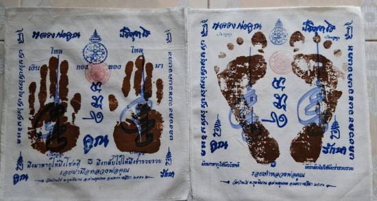 มาคู่ ผ้ายันต์ รอยมือ + รอยเท้า หลวงพ่อคูณ ปริสุทโธ วัดบ้านไร่ นครราชสีมา ปั๊มตราวัด ปี 2551 เเบบสกรีน ( พร้อมรอยจารหลวงพ่อทองศิษย์หลวงพ่อคูณ วัดบ้านไร่ เมตาจารหมึกให้ครับ )