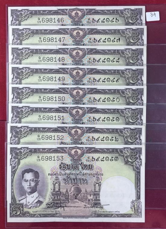 ธนบัตร 5 บาท แบบ 9 โทมัส จำนวน 8 ใบ สภาพใหม่เรียงเบอร์ สวยตามรูป