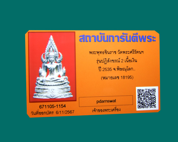 พระพุทธชินราชเนื้อเงิน วัดพระศรีฯ รุ่นปฎิสังขรณ์ พิมพ์ใหญ่ ปี2535 จ.พิษณุโลก + บัตรรับร |