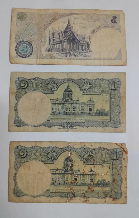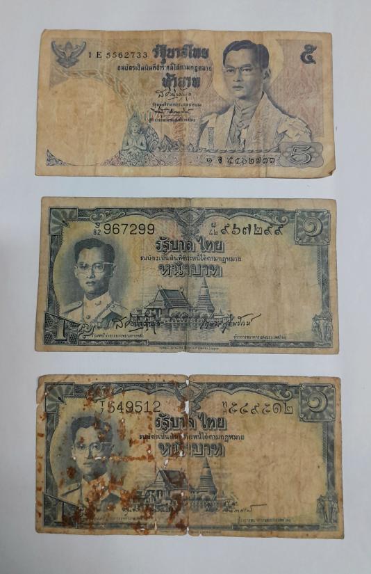 ธนบัตรรัชกาลที่ 9 ฉบับละ 5 บาท และ 1 บาท สภาพใช้งาน ตามรูป