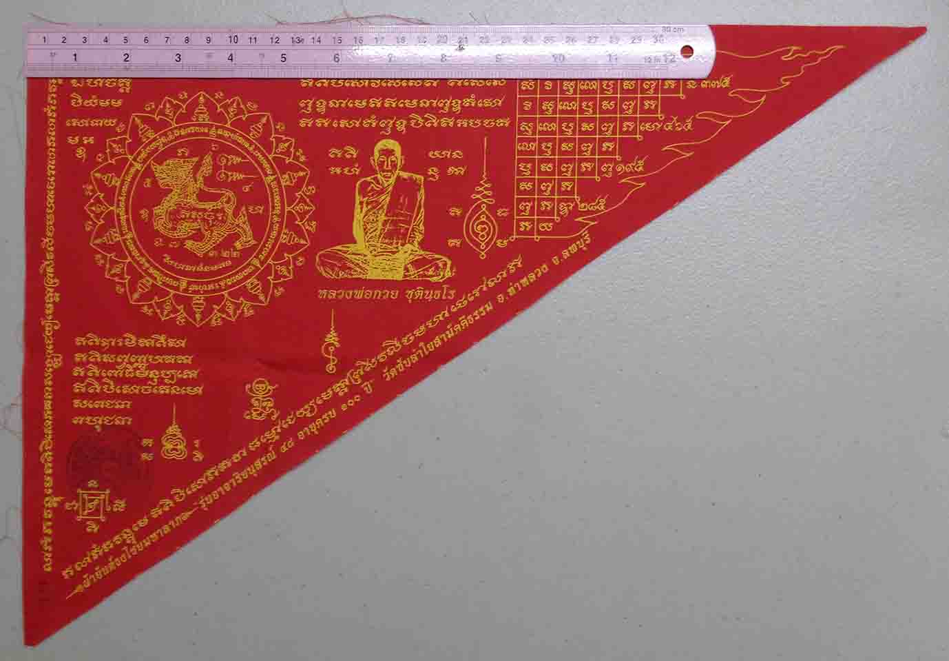วัดใจ ผ้ายันต์ธงไชยมหาลาภ รุ่นอาจาริยนุสรณ์ 48 อายุครบ 100ปี หลวงพ่อกวย วัดซับลำใยสามัคคีธรรม จ.ลพบุรี ปั๊มตราวัด เลข0312 A1 |