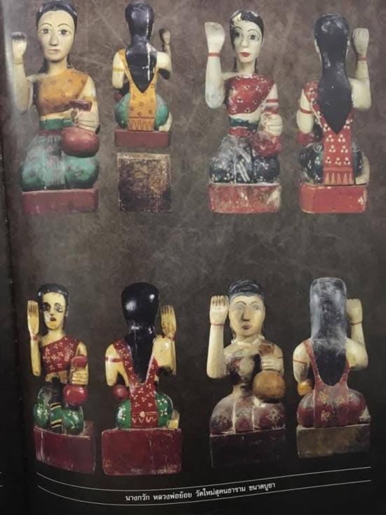 นางกวักหลวงพ่อย้อย วัดใหม่สุคนธาราม จ.นครปฐม เคลือบแชแล็ค สีฝุ่น จัดอยู่ในชุดเครื่องรางยอดนิยม จ.นครปฐม นางกวักหลวงพ่อแกะมาจากไม้ตะเคียนตายพรายหรือยืนต้นตายที่วัดท่าน จัดเป็นไม้ที่มีอาถรรพ์แรงหาไม่ได้ง่ายๆ ศิลป์นิยมครูเรือนขนตางอน สภาพสวย |
