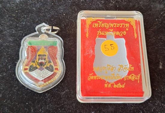 เหรียญพระราหูอมจันทร์ หลวงปู่ศิลา เมตตาอธิษฐานจิต รุ่นเหนือดวง เนื้ออัลปาก้าลงยา เลี่ยมกรอบพร้อมใช้ No.55 |