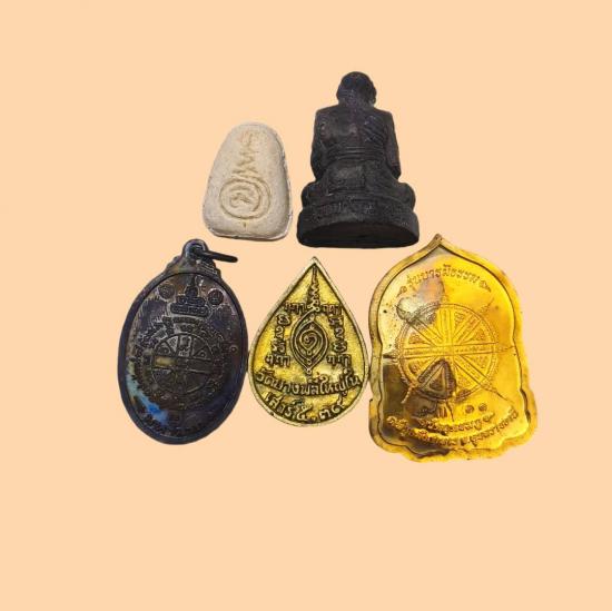 เคาะเดียว 3 เหรียญ 3หลวงพ่อ + พระผง 2 องค์ แท้ไม่ทราบรุ่น ไม่ทราบปีครับ รับประกันตามกฏครับ