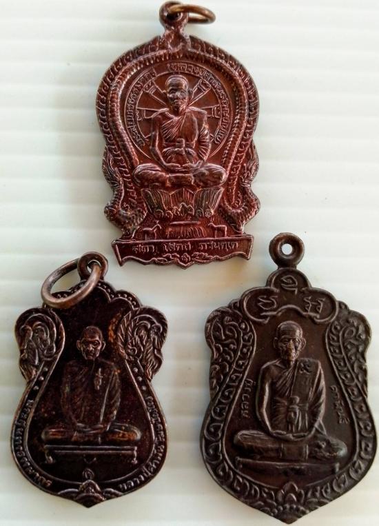 เหรียญนั่งพานปัญญาบารมีปี 37 เหรียญโภคทรัพย์ และเหรียญแซยิดปี 38 หลวงปู่คำพันธ์ วัดธาตุมหาชัย จ.นครพนม รวมรับจำนวน 3 เหรียญ |