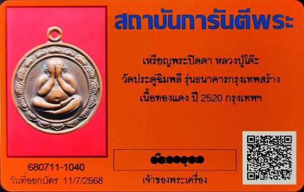 เหรียญพระปิดตา หลวงปู่โต๊ะ วัดประดู่ฉิมพลี รุ่นธนาคารกรุงเทพสร้าง เนื้อทองแดง ปี 2520 กรุงเทพฯ พร้อมบัตรG....