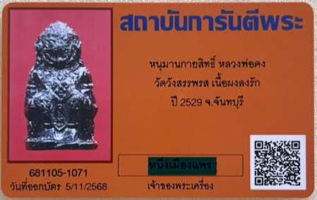 หนุมานกายสิทธิ์ หลวงพ่อคง วัดวังสรรพรส เนื้อผงจุ่มรักฝังตะกรุด พ.ศ. ๒๕๒๙ สภาพสวย พร้อมบัตร G