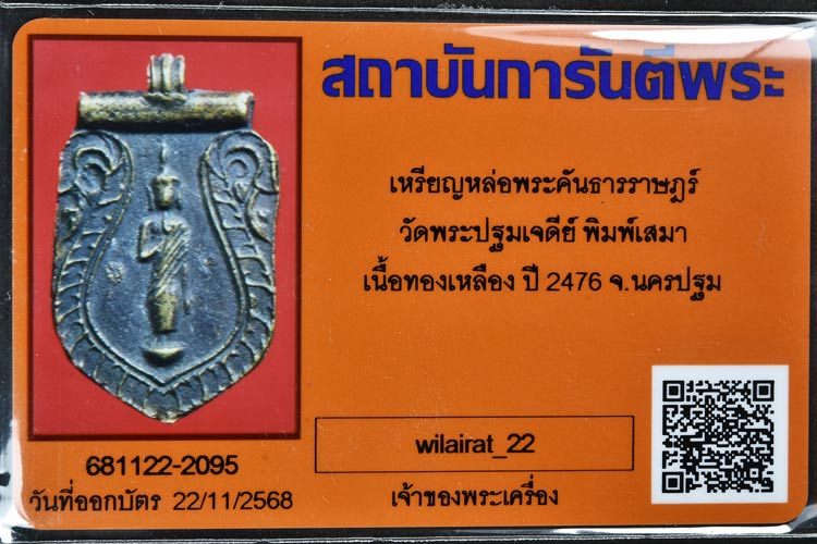 เหรียญหล่อพระคันธารราษฎร์ วัดพระปฐมเจดีย์ พิมพ์เสมา ปี 2476 พร้อมบัตรรับรอง