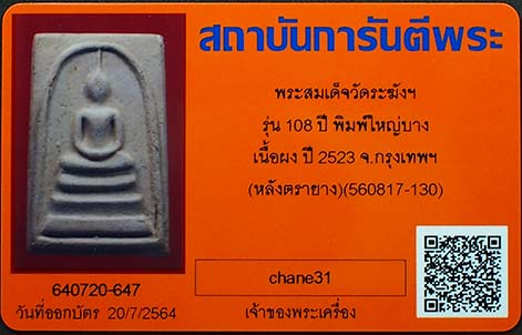 พระสมเด็จ วัดระฆัง รุ่น 108 ปี พิมพ์ใหญ่บาง เนื้อผง ปี 2523 จ.กรุงเทพ หลังตรายาง มีกล่องเดิมพร้อมซองกระดาษหุ้มกล่องและบัตรรับรองสถาบันการันตีพระ