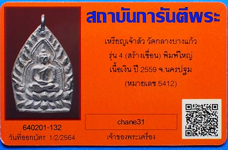 เหรียญเจ้าสัว วัดกลางบางแก้ว รุ่น 4 (สร้างเขื่อน) พิมพ์ใหญ่ เนื้อเงิน ปี 2559 จ.นครปฐม (หมายเลข 5412) พร้อมกล่องเดิมและบัตรรับรองสถาบันการันตีพระ