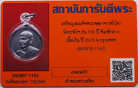 เหรียญสมเด็จพระพุฒาจารย์ (โต) วัดระฆังฯ รุ่น 100 ปี พิมพ์กลาง เนื้อเงิน ปี 2515 จ.กรุงเทพ พร้อมบัตรรับรองสถาบันการันตีพระ