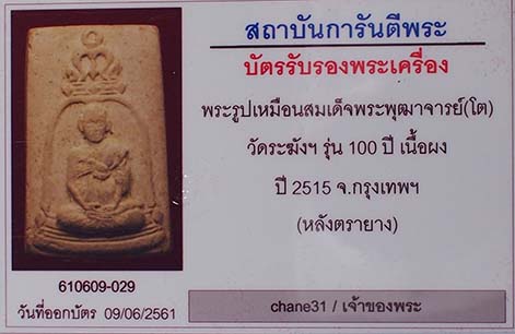 สมเด็จวัดระฆัง 100 ปี พิมพ์รูปเหมือน หลังตรายาง พร้อมกล่องเดิม และบัตรรับรองสถาบันการันตีพระ