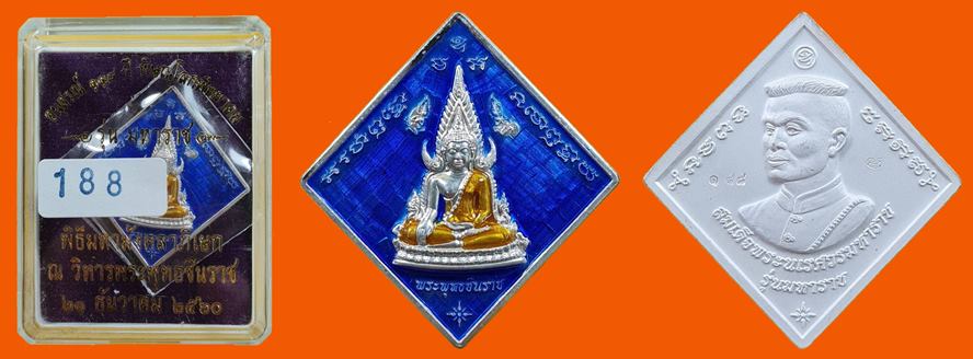เหรียญสี่เหลี่ยมข้าวหลามตัด พระพุทธชินราชหลังพระนเรศวร รุ่นมหาราช 118 ปีเนื้อเงินลงยา(สีน้ำเงิน) หมายเลข 188 สภาพสวยมากๆ พร้อมกล่องครับ