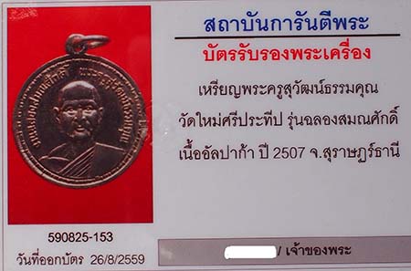 เหรียญพระครูสุวัฒน์ธรรมคุณ วัดใหม่ศรีประทีป รุ่นฉลองสมณศักดิ์ เนื้ออัลปาก้า ปี 2507 จ.สุราษฎร์ธานี พร้อมบัตรรับรองสถาบันการันตีพระ