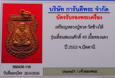 เหรียญหลวงปู่ทวด วัดช้างให้ รุ่นเลื่อนสมณศักดิ์ 49 เนื้อทองแดง (ตอกโค๊ต ท. ) ปี 2553 จ.ปัตตานี พร้อมบัตรรับรองสถาบันการันตีพระ และกล่องเดิม