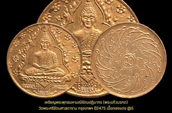 เหรียญพระพุทธมหามณีรัตนปฏิมากร (พระแก้วมรกต) วัดพระศรีรัตนศาสดาราม เนื้อทองแดง กรุงเทพฯ ปี2475 เคาะเดียว