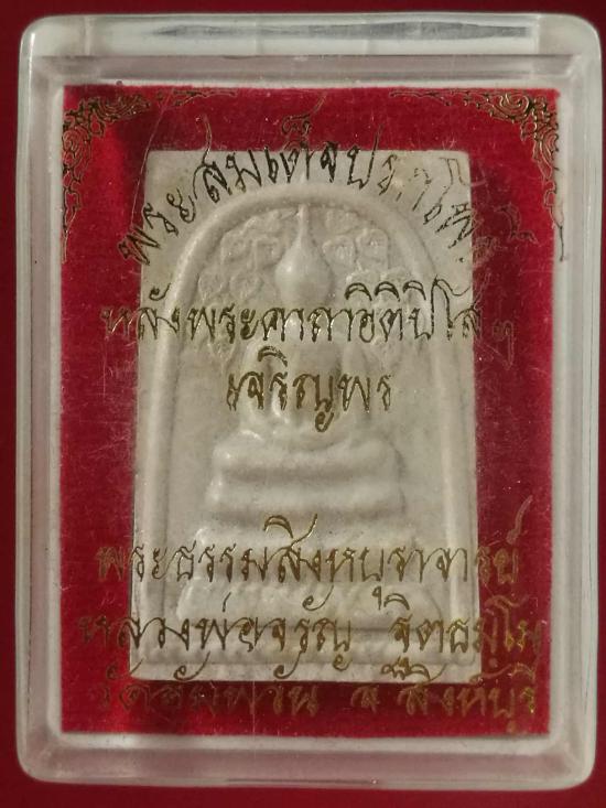 พระสมเด็จปรกโพธิ์ หลังพระคาถาอิติปิโสฯ รุ่นเจริญพร หลวงพ่อจรัญ วัดอัมพวัน จ.สิงห์บุรี เนื้อว่าน ๑๐๘ พร้อมกล่อง