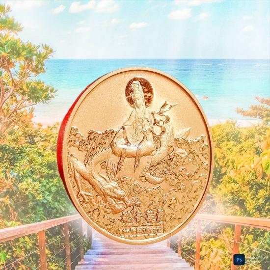ด้านหลังเหรียญเจ้าแม่กวนอิมปางขี่มังกร หรือปางเหยียบมังกร (บางครั้งเรียกว่าปางประทานพรเหยียบมังกร) เป็นสัญลักษณ์แทนความมงคล ความสำเร็จ และความร่มเย็นเป็นสุข เชื่อกันว่าการบูชาปางนี้จะช่วยปัดเป่าสิ่งชั่วร้าย ปกป้องคุ้มครองจากภัยอันตราย เสริมเรื่องความเจริญรุ่งเรือง เลื่อนยศเลื่อนตำแหน่ง และนำมาซึ่งความสำเร็จในทุกด้าน พุทธคุณดังกล่าวมา ยิ่งช่วงนี้ถือศีลกินเจแล้วได้เหรียญเจ้าแม่กวนอิมไปบูชาเสริมดวงด้านการเงิน การงาน การเรียน และความรักให้ประสบผลสำเร็จทันตาเห็นด้วยการปฏิบัติทานเจเจ้าแม่กวนอิมจะให้พรเป็นมงคลแก่ผู้ปฏิบัติให้เห็นผลทันตาเลยครับ มีเหรียญเดียวนะครับ