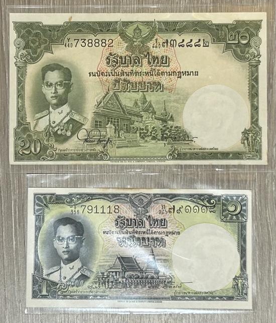 ชุดธนบัตร ร.9 โทมัส 2 ใบ ชนิดราคา 20 บาท และ 1 บาท เลขตอง 111 และ 888 ผ่านใช้สวยๆน่าสะสม |
