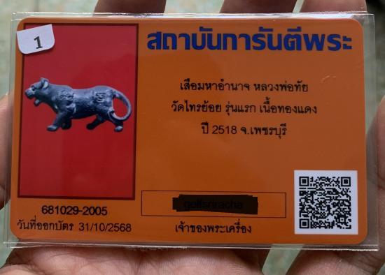 เสือมหาอำนาจรุ่นแรก หลวงพ่อทัย วัดไทรย้อย เพชรบุรี 1 ใน 999 กล่องเดิม บัตร g pra