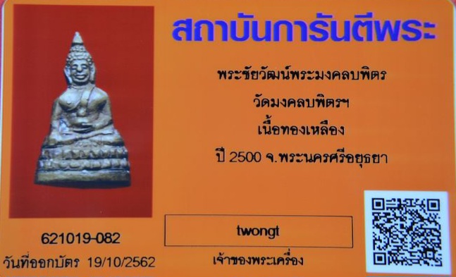 พระชัยวัฒน์หลวงพ่อมงคลบพิตร วัดมงคลบพิตรฯ เนื้อทองเหลือง ปี 2500 จ.อยุธยา พร้อมบัตรรับรอง