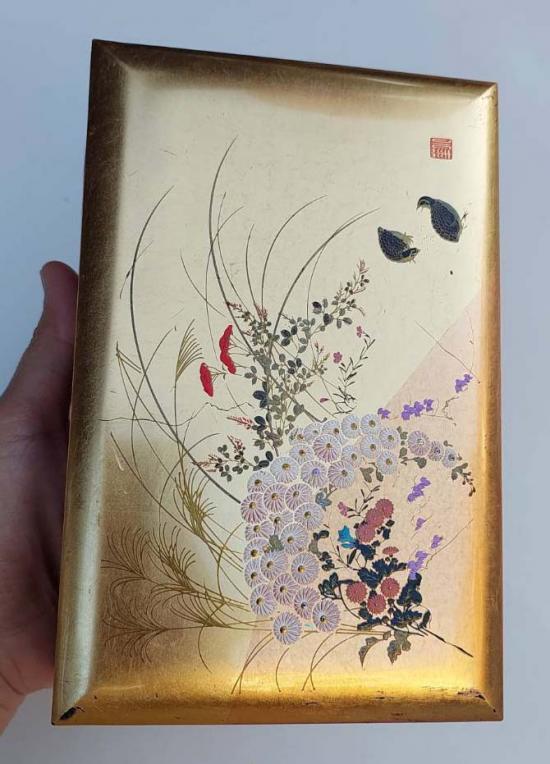 กล่องเครื่องประดับ-อุปกรณ์พระเครื่อง MADE IN JAPAN ของญี่ปุนฝาเพ้นลายทาทอง เป็นกล่องดนตรีด้วย ใช้งานได้