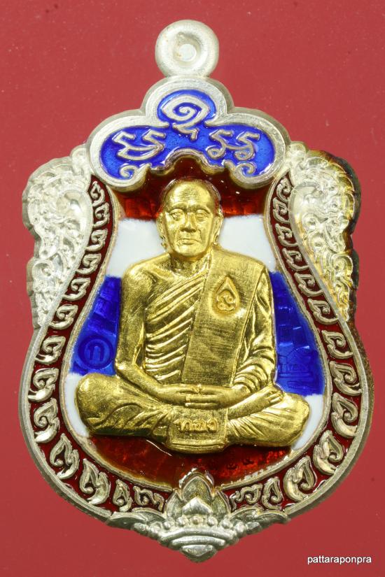 เหรียญเสมาหลวงพ่อทอง รุ่นทองสิบทิศ ปี 2563 เนื้อเงินลงยาสีธงชาติ หน้าทองคำ หมายเลข 124 |
