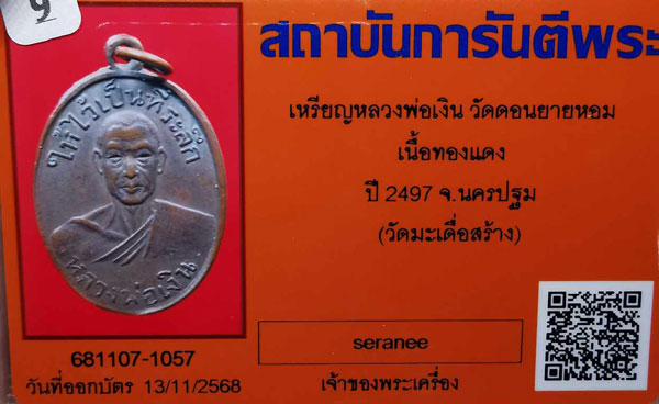 เหรียญหลวงพ่อเงิน วัดดอนยายหอม(ออกวัดท่ามะเดื่อ) เนื้อทองแดง ห่วงเดิม ปี2498 + บัตรG-pra สภาพเดิมค่ะ |