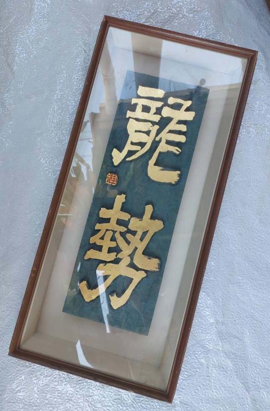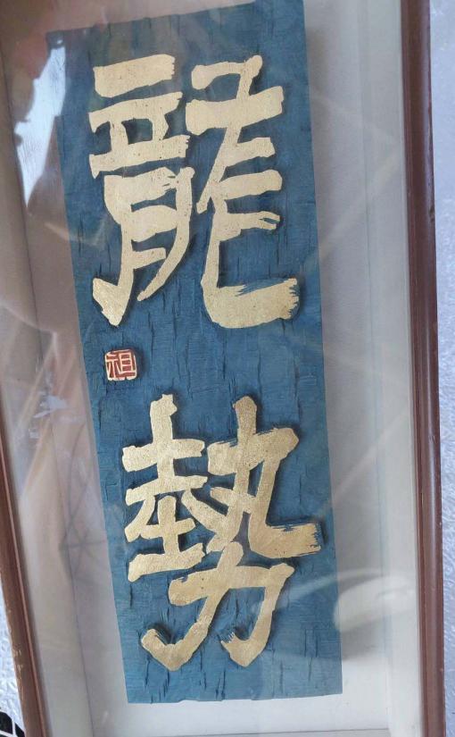 กรอบแสดงการประดิษฐ์ตัวอักษรจีน (พู่กันจีน) คำว่า "龍勢" (ออกเสียงว่า "หลงซื่อ" ในภาษาจีนกลาง) ซึ่งมีความหมายว่า "พลังอำนาจของมังกร" หรือ "กระแสพลังมังกร" ซึ่งมักใช้เพื่ออวยพรให้ประสบความสำเร็จหรือมี