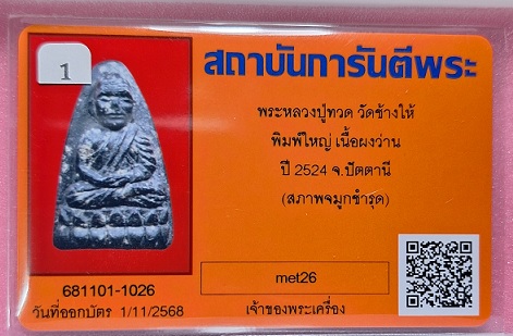 หลวงปู่ทวด เนื้อว่าน ปี 24 พิมพ์ใหญ่ พร้อมบัตรรับรอง