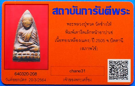 พระหลวงปู่ทวด วัดช้างให้ พิมพ์เตารีดเล็กหน้าอาปาเช่ เนื้อทองเหลือง (แดง) ปี 2505 จ.ปัตตานี พร้อมบัตรรับรองสถาบันการันตีพระ