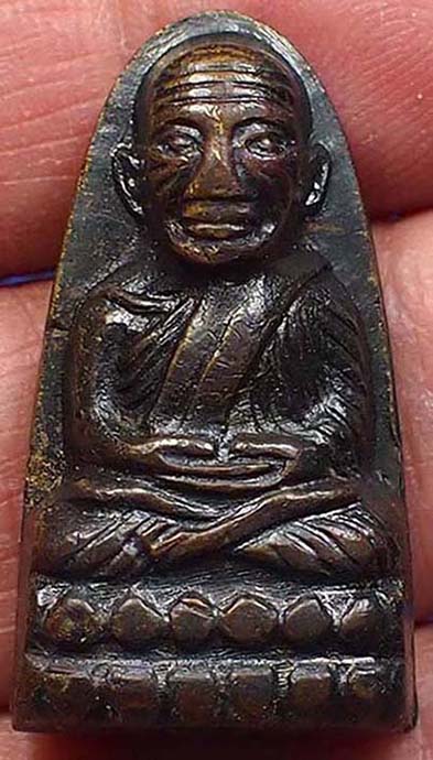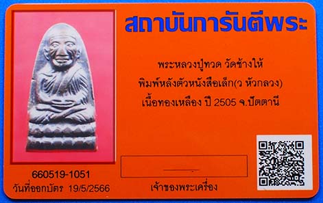 พระหลวงปู่ทวด วัดช้างให้ พิมพ์หลังตัวหนังสือเล็ก ( ว หัวกลวง ) เนื้อทองเหลือง ปี 2505 จ.ปัตตานี พร้อมบัตรรับรองสถาบันการันตีพระ