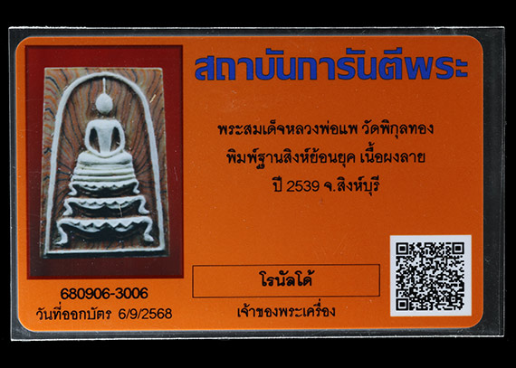 พระสมเด็จ หลวงพ่อแพ วัดพิกุลทอง พร้อมบัตรรับรองจากเว็บ |