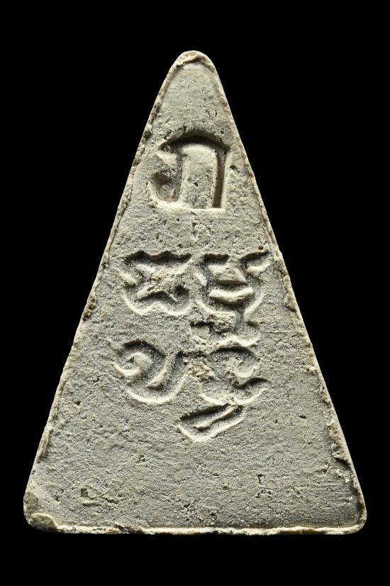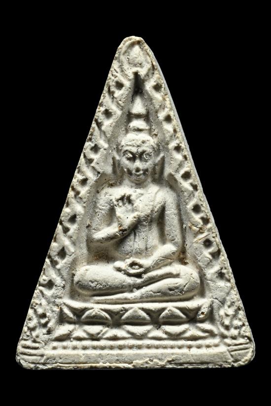 พระผงของขวัญ วัดปากน้ำ พิมพ์สามเหลี่ยม รุ่น 4 หลัง ภ วัดปากน้ำ กรุงเทพฯ พ.ศ. 2514 (สภาพสวย มีเกศา + พลอย)