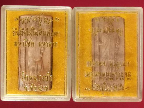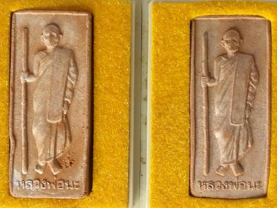 พระผงเนื้อดินเผาหลวงปู่นะ พิมพ์ยืนถือไม้ไผ่ตันพันตา วัดปทุมธาราม (หนองบัว) จ.ชัยนาท มีจารหลังหนึ่งองค์ พร้อมกล่อง 2 องค์