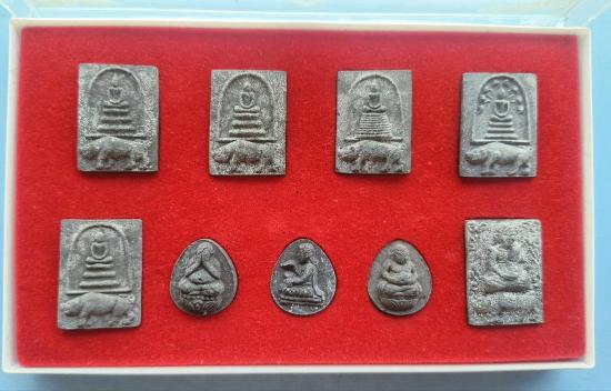 พระชุดที่ระลึกฉลองกรุงรัตนโกสินทร์ 200ปี หลวงปู่เส็ง จันทรังษี วัดบางนา อ.สามโคก จ.ปทุมธานี ปี 2525รวม9องค์ กล่องเดิม