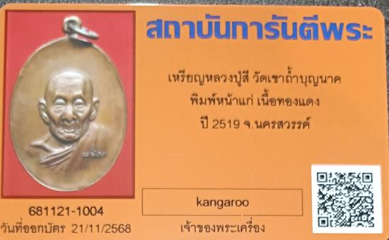 เหรียญหน้าแก่ หลวงปู่สี วัดเขาถ้ำบุญนาค จ.นครสวรรค์ ปี 2519 พร้อมบัตร G-Pra