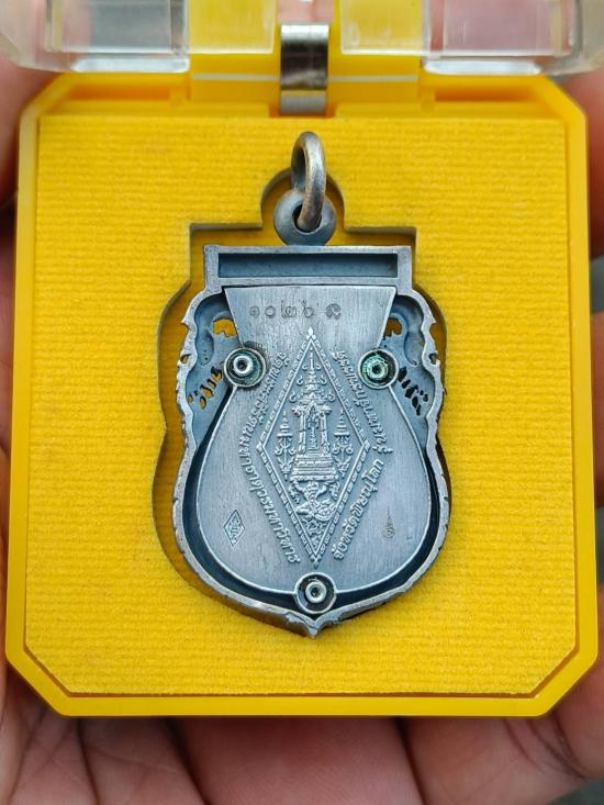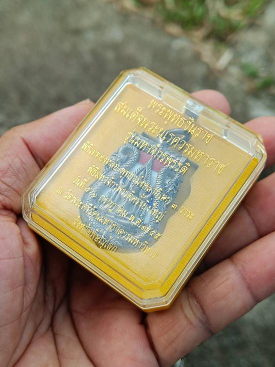 เหรียญพระพุทธชินราชเสมาฉลุลาย ยกซุ้มพญานาค รุ่นมหาจักรพรรดิ ปี 2555 เนื้อบรอนซ์ลงยาราชาวดี สีธงชาติ ชุบเงินซาติน พร้อมกล่องเดิม |