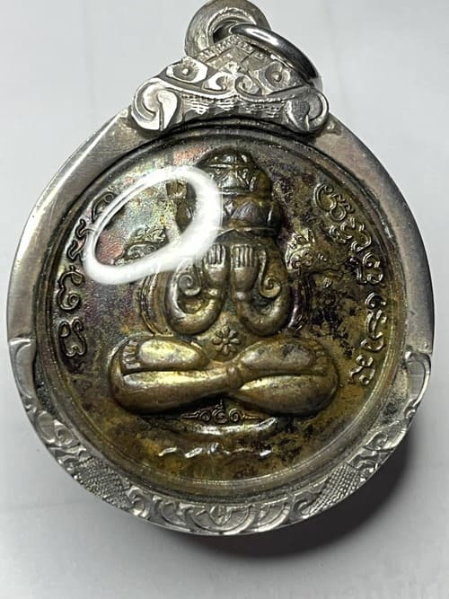 เหรียญปิดตาพังพะกาฬ รุ่นขุมทรัพย์ ทอดน้ำมันเสือผสมว่าน 108 ปี 2549 โค๊ดเจดีย์ สภาพสวยผิวเหลือบ ๆ เลี่ยมเงินพร้อมบูชา จาก20องค์ที่มี องค์นี้เป็นองค์ที่คัดเลี่ยมเงินไว้บูชาเองเป็นองค์สุดท้าย