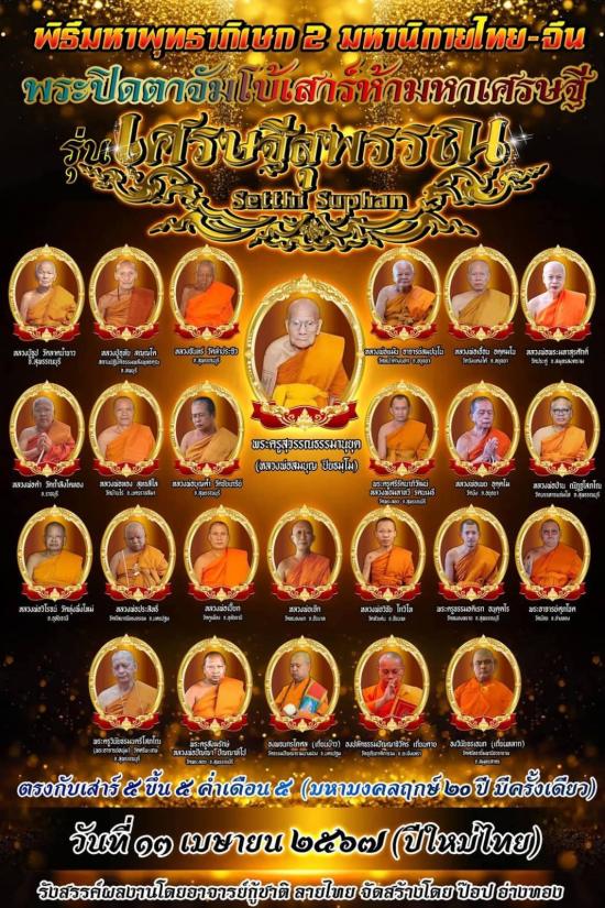 รุ่น เศรษฐีสุพรรณ ทองกระจายเสาร์ 5 พิธีมหาพุทธาพิเษก 2 มหานิกาย ไทย-จีน พระเกจิมากถึง 26 รูป เป็นวาระพิธี ที่ปลุกเสกได้ยิ่งใหญ่มากๆ อีกหนึ่งรุ่น บวกกับ ตรงกับฤกษ์เสาร์ ๕ ตัวผู้ เป็นวันเสาร์ ขึ้น 5 ค่ำ หรือแรม 5 ค่ำ เดือน 5 ตามจันทรคติไทย และตรงกับวันสงกรานต์ นักษัตรที่ 5 เรียกว่า เป็นวันมหาสงกรานต์ หากจะมีวาระพิธี ที่ยิ่งใหญ่ ให้ทุกอย่าง เวียนมาบรรจบ ครบรอบ ตรงกันได้แบบนี้ คงต้องรอไปอีก 100 ปี ตามความเชื่อมาแต่โบราณ การปลุกเสกในครั้งนี้ ที่ตรงกับวาระเสาร์ ๕ จะส่งอิทธิพล ให้วัตถุมงคล เข้มขลัง และ ศักดิ์สิทธิ์ มีพุทธคุณมากขึ้น เป็นทวีคูณ พระปิดตาเศรษฐีสุพรรณ ทองกระจายเสาร์ ๕ ได้ทำการพุทธาพิเษก เมื่อวันที่ 13 เม.ย. 67 ส่วนที่มาของคำว่า ทองกระจายเสาร์ ๕ เพราะได้รวบรวมแผ่นทอง จากวัดต่างๆ ทั้ง 4 ภาค ทั่วฟ้าเมืองไทย หนักถึง 38 กิโล มาผสมลงในมวลสาร ทำให้เราสามารถเห็นได้ถึง มวลสารแผ่นทอง ที่กระจายอยู่ทั่วองค์พระ ทรงคุณค่าเป็นอย่างมาก มีเกศาหลวงปู่ด้วยครับ