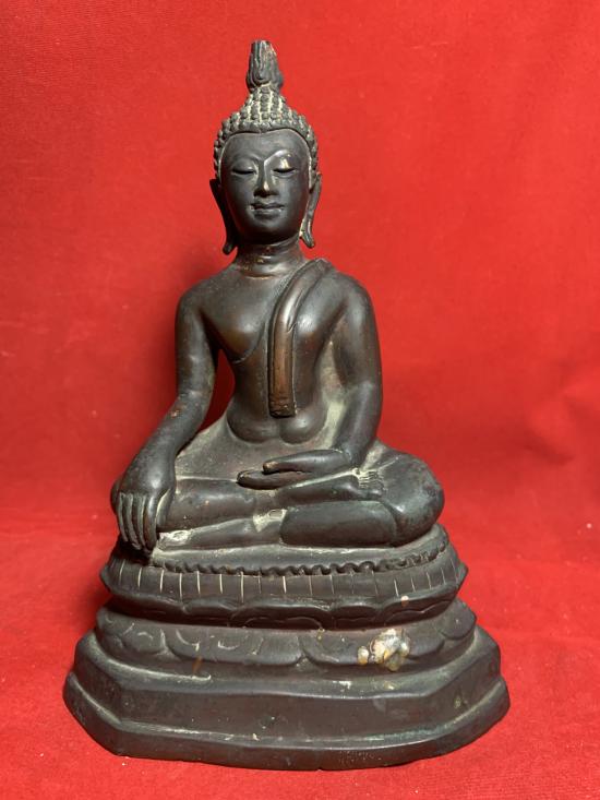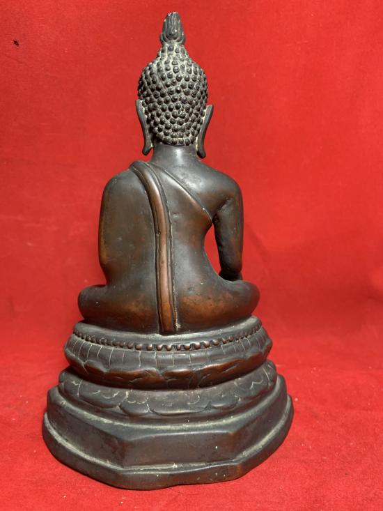 พระบูชารัชกาล เนื้อแดง ฐานดินไทย หน้าตักประมาณ 4 นิ้วหย่อนนิด ปลายเกศหักตามรูป เคาะเดียวเบาๆ |