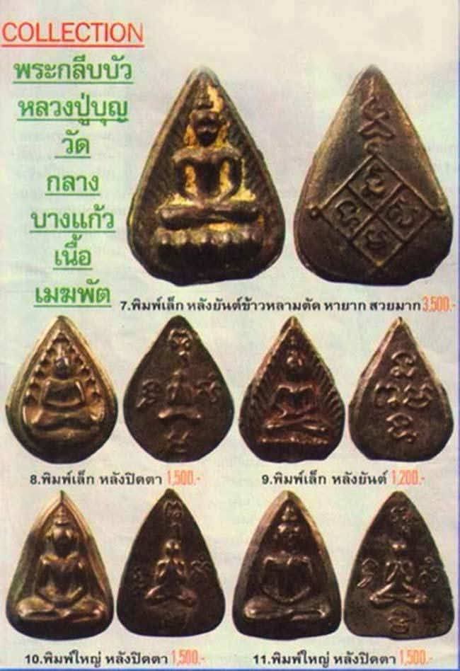 พระหลวงปู่บุญเนื้อเมฆพัด ในหนังสือประวัติและการสร้างพระเครื่องของพระพุทธวิถีนายก(บุญ) เป็นหนังสือเล่มวัดเล่มแรก จัดทำขึ้นเมื่อปี พ.ศ. ๒๕๒๘ จำนวน ๕,๐๐๐เล่ม ให้ทำบุญที่วัดกลางบางแก้วเล่มละ ๑๘๐ บาท เขียนโดย อ.สุธน ศรีหิรัญ ได้กล่าวไว้ว่าพระเนื้อเมฆพัด เท่าที่สืบทราบอย่างแน่ชัดมีทั้งสิ้น ๗พิมพ์ และ๗พิมพ์ดังกล่าว ล้วนได้ข้อมูลมาจากผู้ที่ได้รับพระมาจากมาจากหลวงปู่บุญ โดยตรงทั้งสิ้น ล้วนแต่เป็นศิษย์ใกล้ชิดกับหลวงปู่และได้รับพระเนื้อเมฆพัดจากมือหลวงปู่บุญ(หลวงปู่แจกให้กับมือหลวงปู่เอง) ซึ่งผู้เขียนบอกว่าอาจจะมีมากพิมพ์กว่านี้แต่ทั้ง๗พิมพ์ที่จะกล่าวถึงนี้ แน่นอน ชีชัดด้วยประจักษ์พยานการได้รับมากับมือหลวงปู่โดยตรงทั้งสิ้น ผู้เขียนยังได้ฝากไว้ให้เป็นข้อคิดอีกอย่างหนึ่งว่า หลวงปู่บุญกับหลวงปู่นาค วัดห้วยจระเข้นั้นมีความสนิทสนมกันมาก ไปมาหาสู่กันอยู่เสมอ และหลวงปู่นาคก็เปรียบเป็นเจ้าตำรับเป็นอาจารย์ใหญ่แห่งเนื้อเมฆพัด ดังนั้นหลวงปู่บุญก็คงจะได้รับสูตรการทำมาบ้างไม่มากก็น้อย โดยจะพบว่าพระเนื้อเมฆพัดของหลวงปู่บุญ เนื้อสีออกขาบเข้มดำ คล้ายกับพระปิดตาห้วยจระเข้ของหลวงปู่นาคมาก
