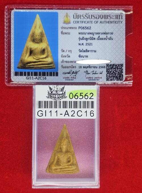 พระนางพญา หลวงพ่อกวย วัดโฆสิตาราม เนื้อผงน้ำมัน ปี2521 พร้อมบัตรรับรองสมาคมพระเครื่องพระบูชาไทย