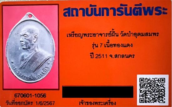 เหรียญรุ่นนี้มีการจัดสร้างเนื้อเดียวคือ เนื้อทองแดง ลักษณะของเหรียญอาจารย์ฝั้น รุ่น 1 ถึงรุ่น 7 มีจุดเด่นสำคัญ คือ ด้านหน้าเหรียญจะใช้บล็อกเหรียญพระอาจารย์ฝั้นรุ่นแรกเหมือนกันหมด ด้านหลังเหรียญจะใช้บล็อกแต่ละรุ่นไม่เหมือนกัน เอกลักษณ์ของเหรียญพระอาจารย์ฝั่น รุ่น7 กับ รุ่น 6 จะมีลักษณะที่คล้ายคลึงกัน โดยลักษณะตัวยันต์ด้านหลังจะเหมือนกันหมด แต่จะมีความแตกต่างตรงที่เหรียญ รุ่น 7 จะมีดอกจันทร์อยู่ด้านบน...เหรียญที่นำมาลงนี้เนื้อทองแดงผิวรมดำสภาพสวยผิวเดิมปราศจากการตบแต่งใดๆทั้งสิ้นครับ
