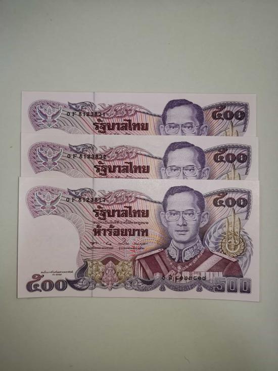 ธนบัตรรักาลที่ 9 ไม่ผ่านการใช้ ฉบับละ 500 บาท รวม 3 ฉบับ ตามรูปเคาะเดียว