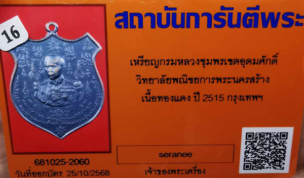 เหรียญกรมหลวงชุมพรเขตร์อุดมศักดิ์ฯ(เสด็จฯเตี่ย) จัดสร้างโดยพณิชยการพระนคร เนื้อทองแดง ปี2515 จ.กรุงเทพฯ (หลวงปู่โต๊ะร่วมปลุกเสก) + บัตรG-pra สภาพเดิมค่ะ